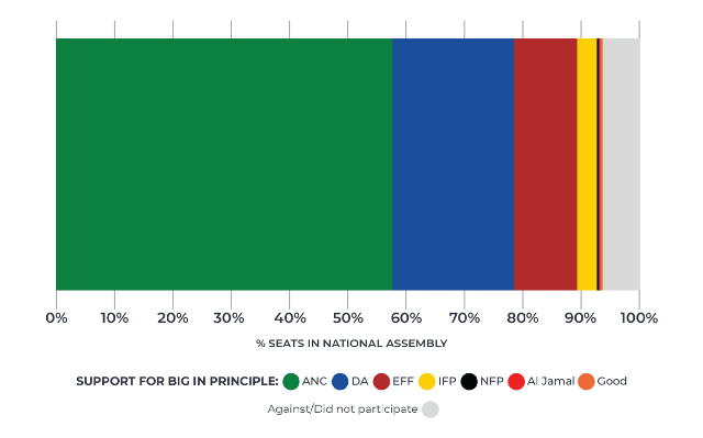 The figure below shows that there was broad support in principle for BIG from most of the political parties that participated in the Mini-Plenary. This would mean that about 90% of the National Assembly would favour BIG. There were differences in opinion regarding the capacity and credibility of the Government to deliver BIG. Also debated were the mechanism of delivery and the capacity of the fiscus and tax base to fund BIG.