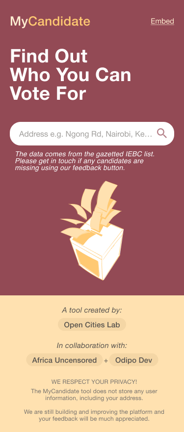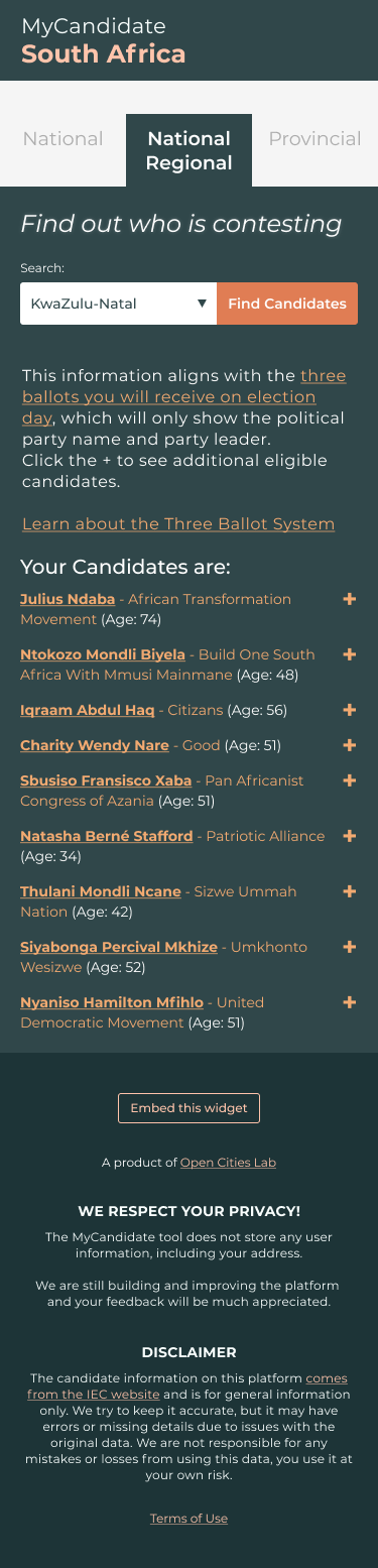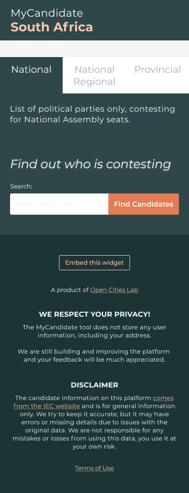 Ahead of South Africa’s 2024 National Elections, voters faced an overwhelming number of political parties and, for the first time, independent candidates. The only official source of information was a set of lengthy PDFs from the IEC which was impractical for most people to navigate. To bridge this gap, Open Cities Lab launched MyCandidate South Africa, an interactive, easy-to-use tool that organised complex electoral data into a simple, searchable platform. With over 14,000 users and thousands more engaging with educational resources, MyCandidate made electoral data transparent, usable, and empowering for South Africans at the polls.