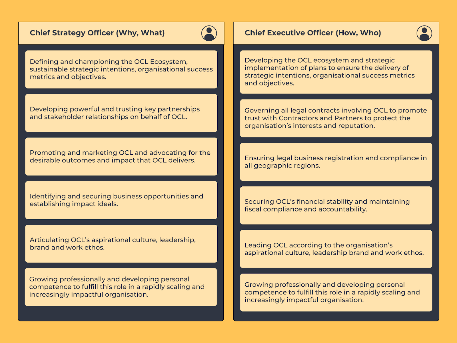 Initially, the idea of a Co-CEO model was considered, but through extensive discussions and research we decided that a Co-Leadership model would better suit our needs at OCL. This model was further inspired by a convening held by Luminate, a key OCL partner and funder since 2019. This convening provided Richard and Megan with the space and support to explore what the co-leadership model could look like. This approach allows for distinct yet complementary roles, harnessing the unique strengths and competencies of two leaders.