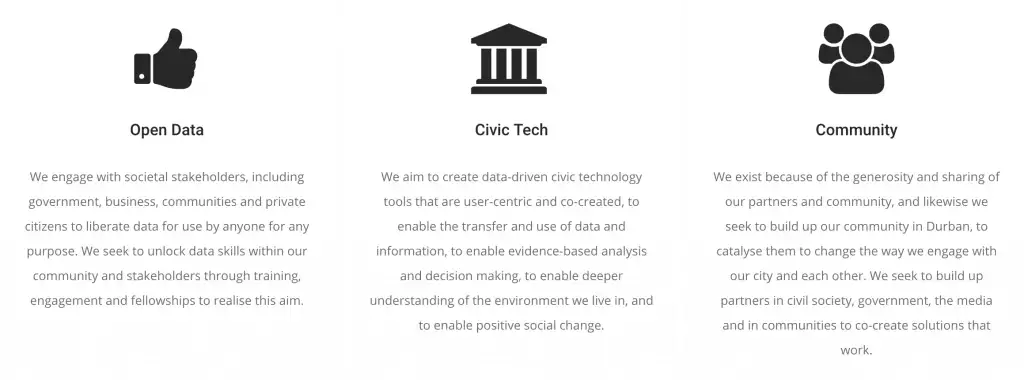 Since that first meetup there have been a number of streams that have built Open Data Durban into what it is now, and importantly given us our path and mission. I realised that I alone could not build an organisation that wanted to enact change and have an impact in the city, and so we set up a steering committee to drive us to sustainability. Since August 2015, the steering committee has guided the organisation by creating (and debating and editing and re-editing) our constitution and founding principles, assisting with events, and providing guidance on key strategic decisions. I cannot express how grateful I am for this amazing group of people who volunteered their time and know-how to establish the rock-solid base on which we are building this organisation.